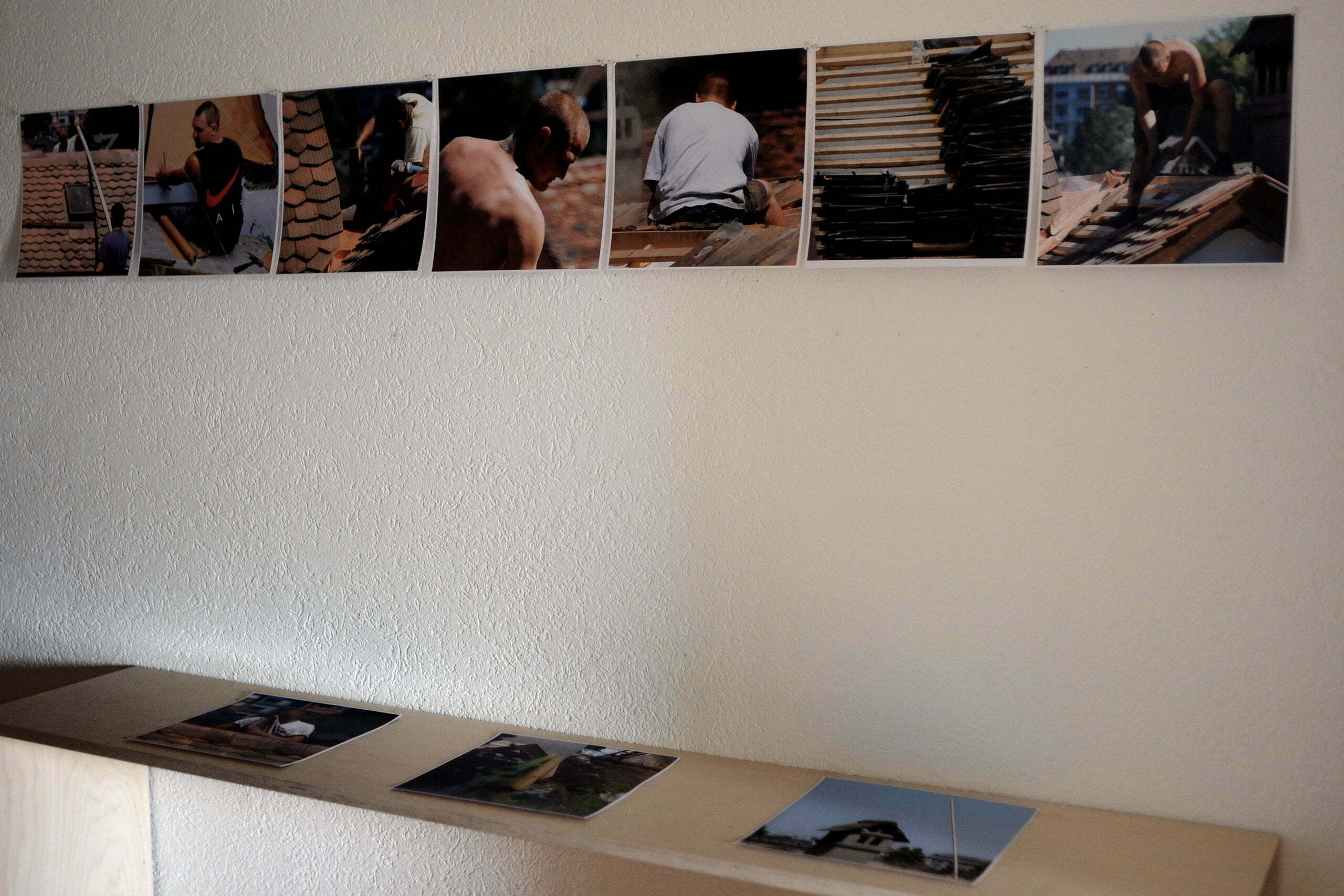 „Ziegelfänger“ ist eine Installation von Fotos und Zeichnungen, eine Hommage an die Berner Altstadt, in der es um Ziegel und um das Dachdecken geht. Die bewusst vielschichtige Aussage der Bilder steht in Beziehung zu den Räumen die, meist verborgen, zwischen der unendlichen Vielfalt der Ziegeldächer liegen.